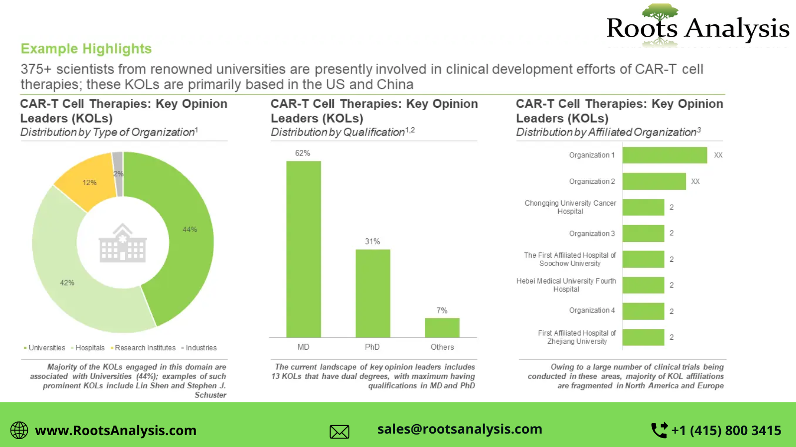 - An insightful analysis highlighting the key opinion leaders (KOLs) in this domain featuring an analysis of the various principal investigators of clinical trials related to CAR-T cell therapies, considering them to be KOLs, who are actively involved in R&D of CAR-T cell therapies. In addition, the chapter presents an analysis, comparing the relative expertise of KOLs based on a proprietary scoring criterion and that of a third party.