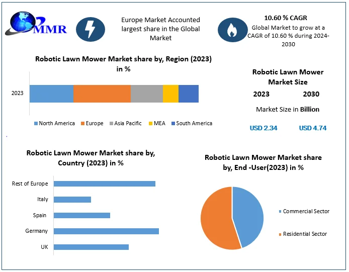 Robotic Lawn Mower Market was valued at USD 2.34 Bn in 2023 and is expected to reach USD 4.74 Bn by 2030, at a CAGR of 10.60 % during the forecast period.