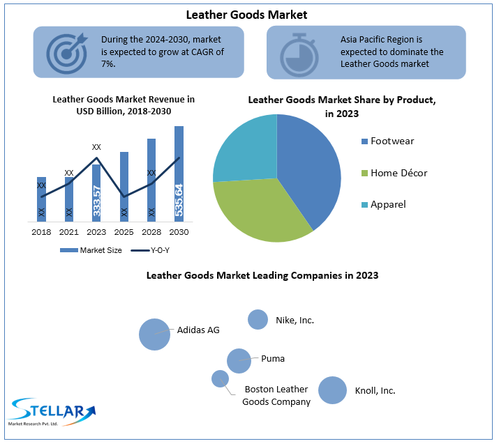 Leather Goods Market was valued at USD 333.57 billion in 2023. Global Leather Goods Market size is estimated to grow at a CAGR of 7% over the forecast period.