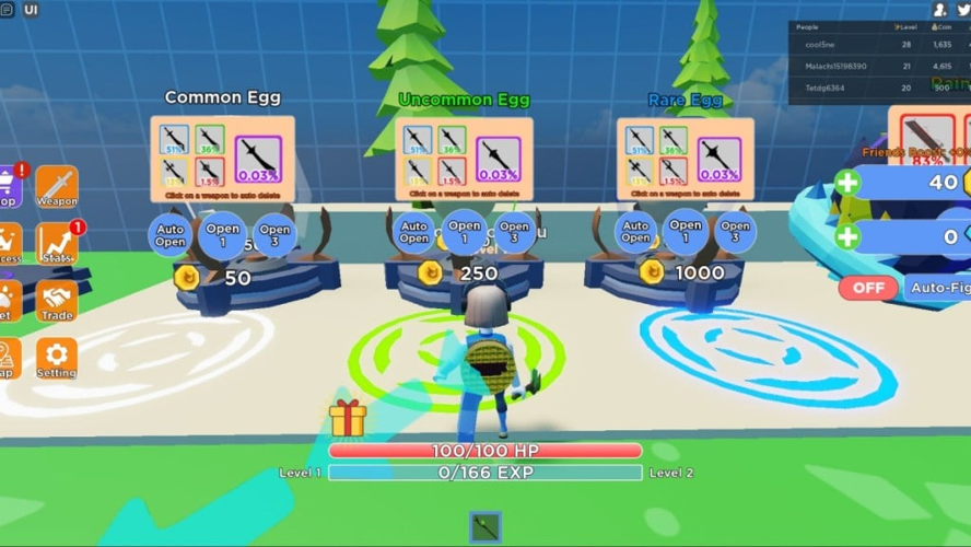 Tier 1 Swords: - Common Egg: 50 coins - Uncommon Egg: 250 coins - Rare Egg: 1,000 coins - Rainbow Egg: 149 Robux