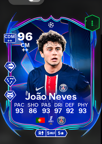 João Pedro Gonçalves Neves's UCL Road to the Finals card showcases an exceptional Center Midfielder with an impressive overall rating of 96, making him a formidable presence on the field. Neves is equipped with a remarkable pace rating of 93, allowing him to swiftly navigate the pitch and maintain high energy throughout the match. His shooting rating of 86 ensures that he can capitalize on scoring opportunities, while his passing rating of 93 enables him to deliver precise and strategic plays. With an outstanding dribbling rating of 97, Neves can effortlessly maneuver past defenders, creating advantageous situations for his team. His defense rating of 92 and physicality rating of 93 further solidify his role as a versatile and resilient midfielder. The advantages of this card are evident in Neves's ability to dominate the midfield, orchestrate attacks, and provide robust defensive support, making him an invaluable asset to any team aiming to dismantle opponents and secure victory in crucial matches.