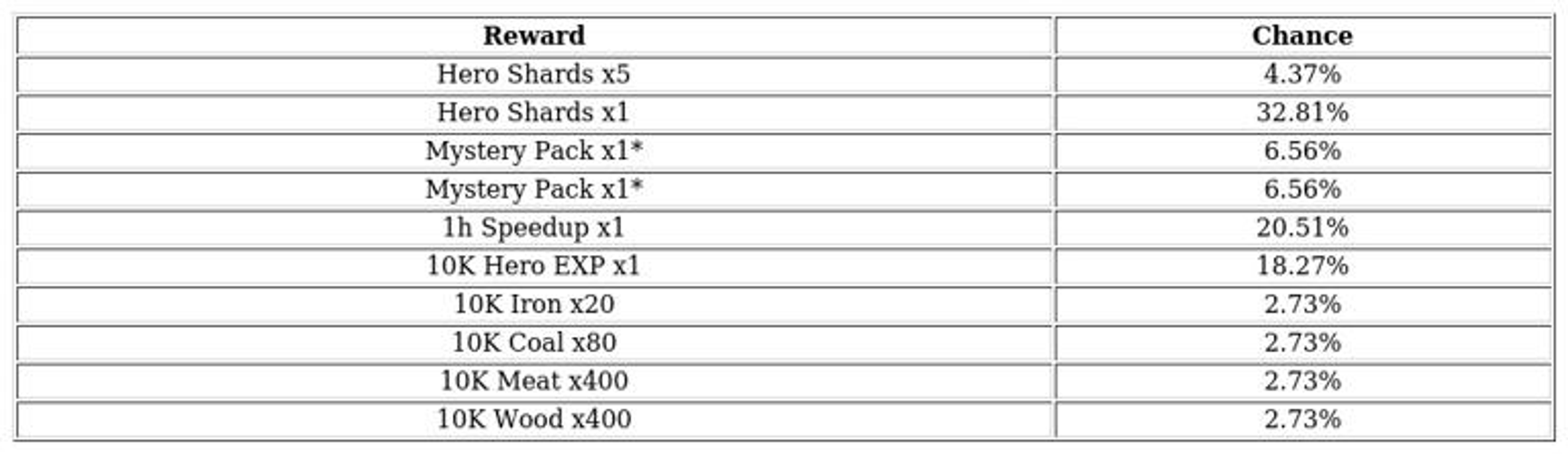 Every spin of the lucky wheel presents a chance to win various items, each with a small probability. The specific rewards are listed in the table below, where hero shards are matched to the corresponding generation's lucky wheel heroes.