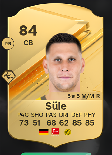 In the realm of virtual football, where defensive prowess is as crucial as offensive flair, Niklas Süle's Rare card stands out as a bastion of strength and reliability. As a Center Back with an impressive overall rating of 84, Süle's card boasts a formidable defense rating of 85 and a matching physicality score, making him an immovable object at the heart of the defense. With a pace rating of 73, he is more than capable of keeping up with swift attackers, while his passing rating of 68 allows for initiating counter-attacks from the back. Although not known for his shooting or dribbling, with respective ratings of 51 and 62, Süle's card offers a significant advantage in his position; his sheer defensive presence and physical dominance can help players maintain a clean sheet and control the tempo of the game, ultimately leading to victory on the virtual pitch.