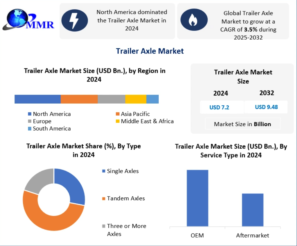 The Global Trailer Axle Market was valued at USD 7.2 billion in 2024 and is projected to reach approximately USD 9.48 billion by 2032, growing at a CAGR of 3.5% during the forecast period. The market growth is driven by increasing demand for medium to heavy-duty trailers, the adoption of lightweight materials, and the rising need for fuel-efficient, durable axle solutions.