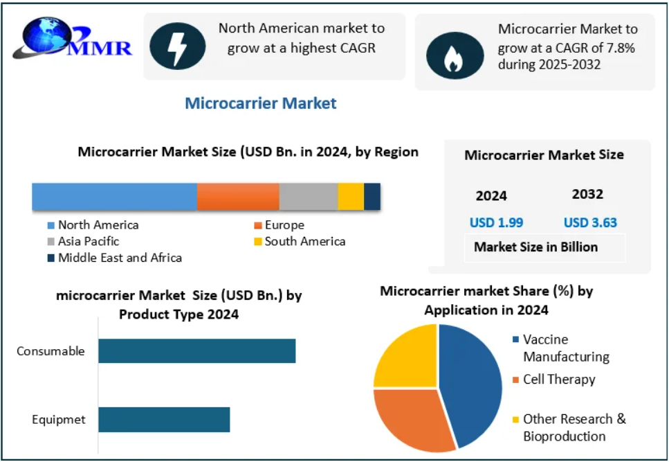 The global Microcarrier Market, valued at USD 1.99 billion in 2024, is poised for substantial growth, with projected revenue expected to reach approximately USD 3.63 billion by 2032, growing at a CAGR of 7.8%. Microcarriers—tiny bead-like substrates designed for the expansion of adherent cells—are becoming indispensable in large-scale cell culture, particularly in vaccine production, cell therapy, regenerative medicine, and biopharmaceutical manufacturing.