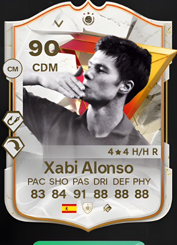 Hailed as a midfield maestro, Xabi Alonso's Golazo Icon card captures the essence of his playmaking brilliance. Positioned as a Central Defensive Midfielder, this card boasts an impressive overall rating of 90, reflecting his balanced and formidable skill set. With a pace rating of 83 and shooting rating of 84, Alonso can surge forward and strike with precision, while his exceptional passing rating of 91 ensures that every distribution is a potential game-changer. The card's dribbling rating of 88 allows for smooth navigation through tight spaces, complemented by a stalwart defense and physicality rating of 88 each, fortifying the midfield line. The advantages of Alonso's Golazo Icon card in his role are undeniable; his sharp tactical awareness and ability to dictate the tempo of the game enable players to dismantle the opposition's defense methodically and carve out opportunities to clinch victory on the virtual pitch.