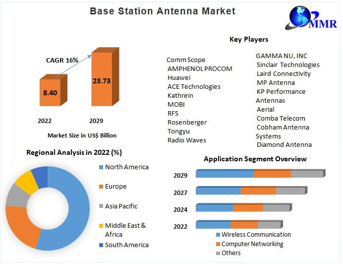 Base Station Antenna Market was valued at US$ 8.40 Bn. in 2022. Global Base Station Antenna Market size is expected to grow at a CAGR of 16% through the forecast period.